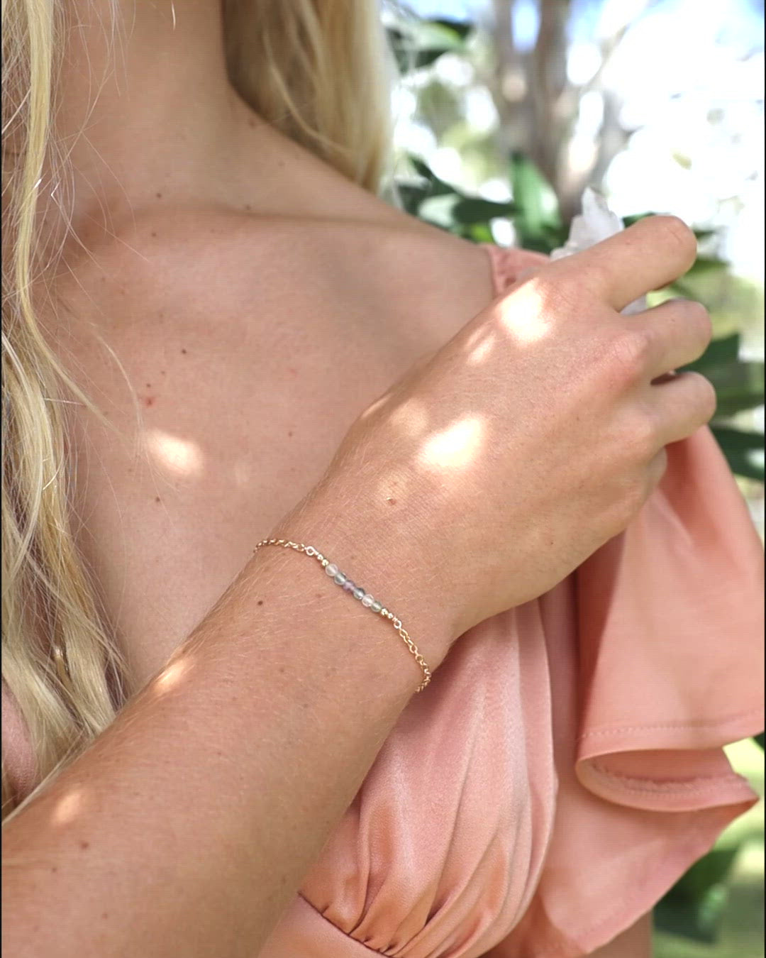 Make every day special in our tiny rainbow fluorite gemstone bead bar bracelet. This bracelet is a dainty, feminine design. The semi-precious gemstone beads used in this bracelet are made from natural, genuine gemstones that have been faceted cut so they sparkle in the light, making it the ideal bracelet for evening wear, weddings and special occasions.