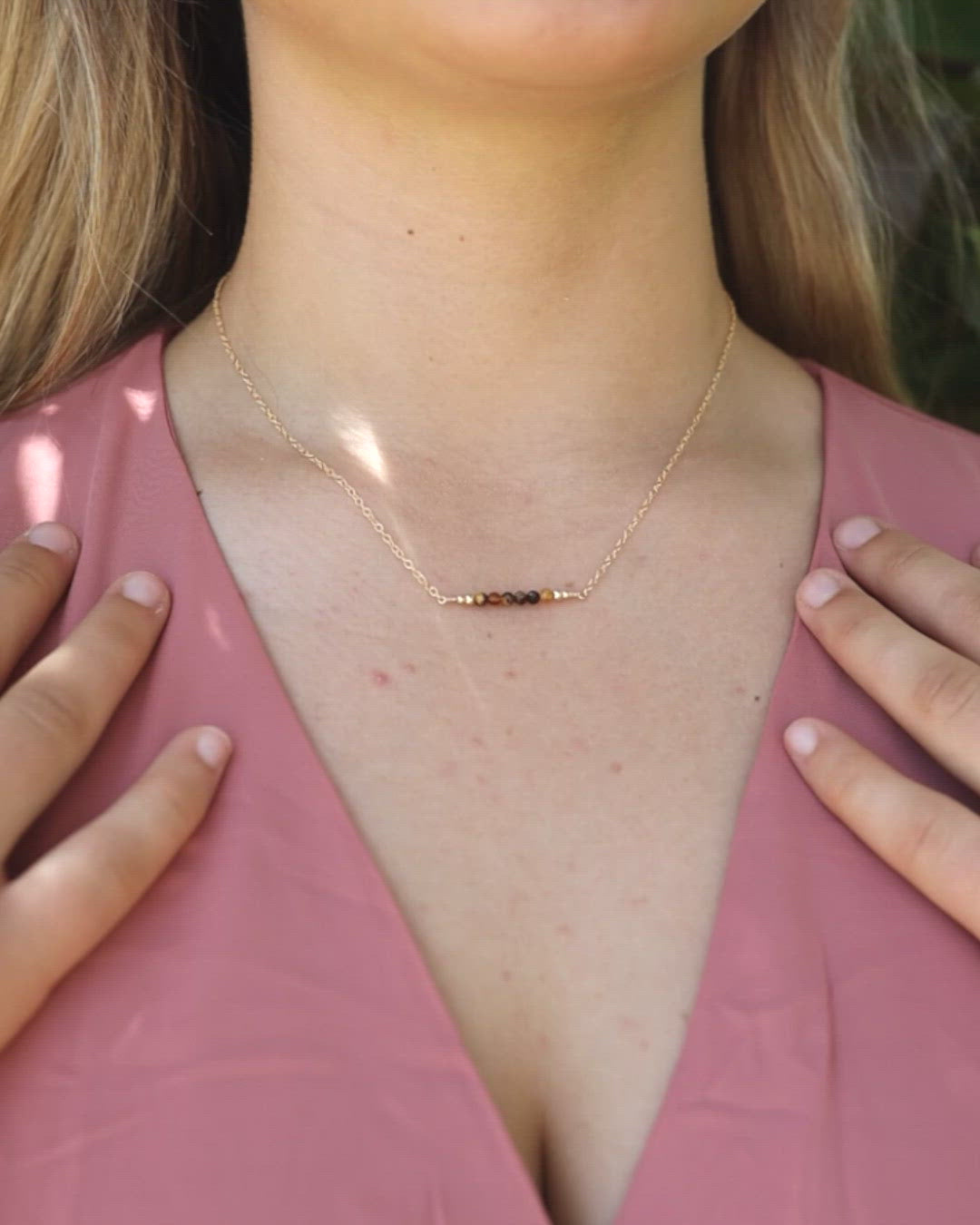 Make every day special in our tiger's eye tiny bead bar necklace. This necklace is a dainty, feminine design that looks lovely worn either alone or layered with other dainty necklaces. The semi-precious gemstone beads used in this necklace are made from natural, genuine gemstones that have been faceted cut so they sparkle in the light, making it the ideal necklace for evening wear, weddings and special occasions.