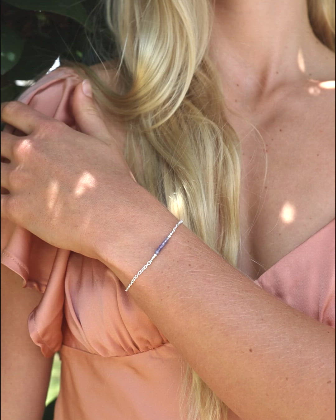 Make every day special in our tiny purple tanzanite gemstone bead bar bracelet. This bracelet is a dainty, feminine design. The semi-precious gemstone beads used in this bracelet are made from natural, genuine gemstones that have been faceted cut so they sparkle in the light, making it the ideal bracelet for evening wear, weddings and special occasions.